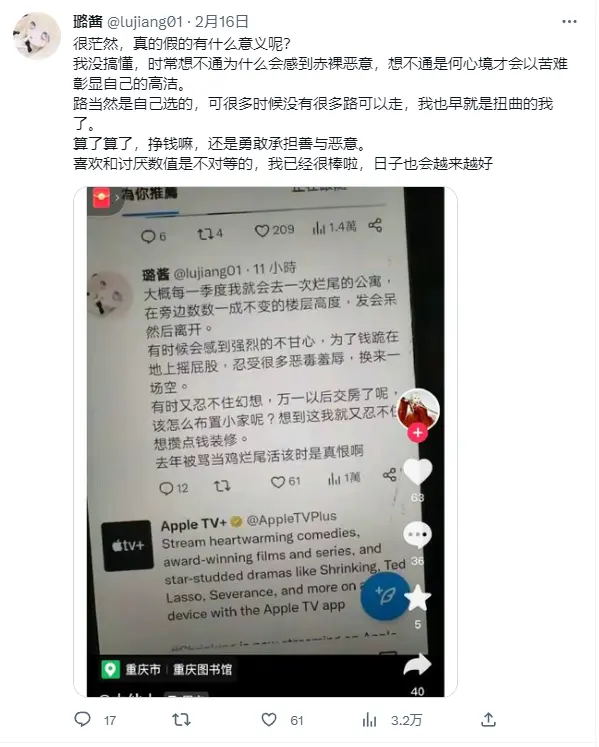 逛知乎的时候看到一个问题“房子卖不动到底是因为年轻人真的醒悟了还是因为没钱?”,点进去看到点赞很高的一篇回答说,推上的一个福利姬,辛辛苦苦卖p赚钱买了套房,结果烂尾了,最后只能自我安慰,期待日子越变越好。